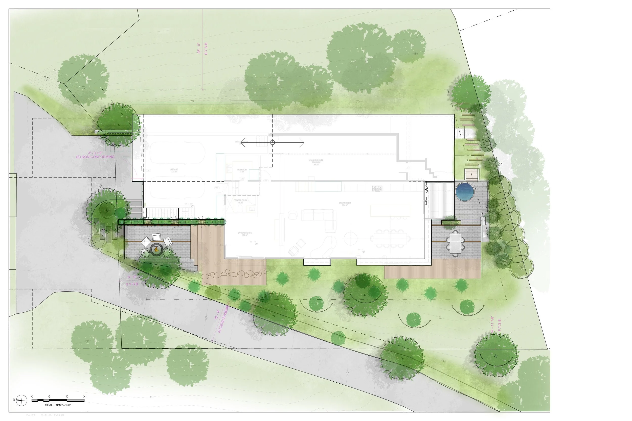 Set on a steep Tiburon hillside overlooking the Bay and Belvedere Island, this project re imagines a historic structure once used by the Northern Pacific Railroad to store train records. The design honors the site’s working past through a modern architectural language rooted in material honesty — weathered wood, textured unit pavers, corten steel, and board-formed concrete echo the vernacular utility of the original barn while introducing refined, contemporary forms. Landscape interventions navigate the tight slope with terraced platforms, permeable pathways, and sculptural planting that connect structure and terrain. A fire-adapted, drought-tolerant plant palette — rich in resilient California natives — grounds the architecture in its climate, elevating the design with an understated, ecological elegance that recalls the spirit of the site’s origin.